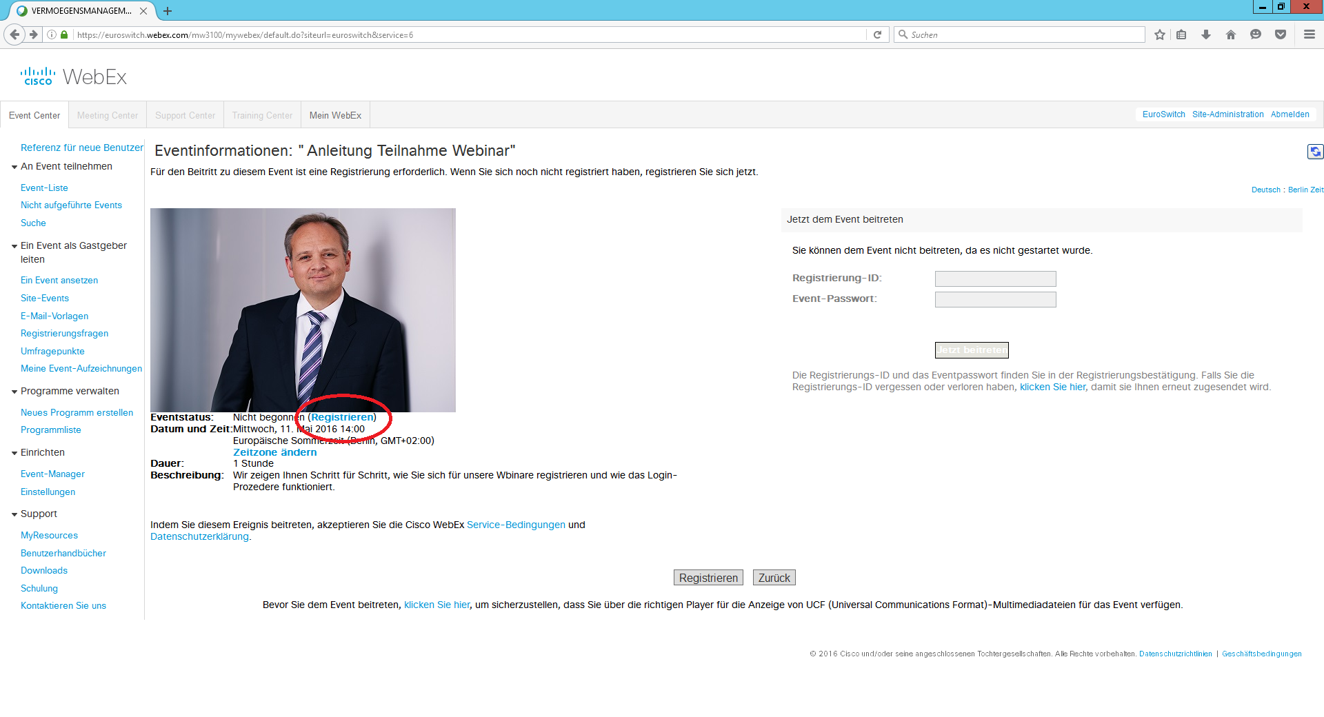 Schritt 2: Es öffnet sich ein Fenster mit näheren Eventinformationen. Klicken Sie unterhalb des Fotos von Thomas Böckelmann auf "Registrieren".