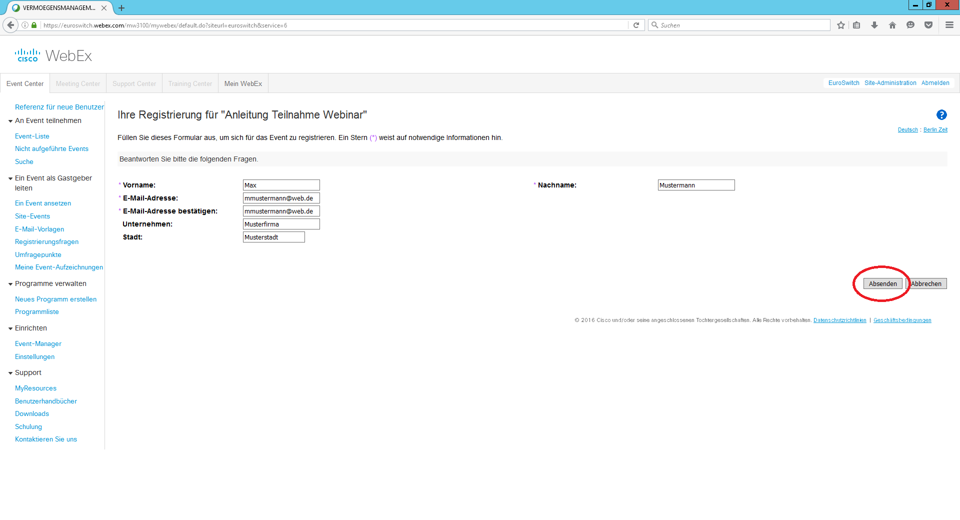 Schritt 3: Füllen Sie auf der folgenden Seite das Registrierungsformular aus. Lediglich Ihr Name und Ihre E-Mail-Adresse sind obligatorisch. Die Daten werden selbstverständlich vertraulich behandelt und nicht an Dritte weitergegeben. Nachdem Sie Ihre Daten eingetragen und auf "Absenden" geklickt haben, erhalten Sie eine Bestätigungs-E-Mail an die angegebene Adresse. In der E-Mail befinden sich Registrierungs-ID und Zugangslink.