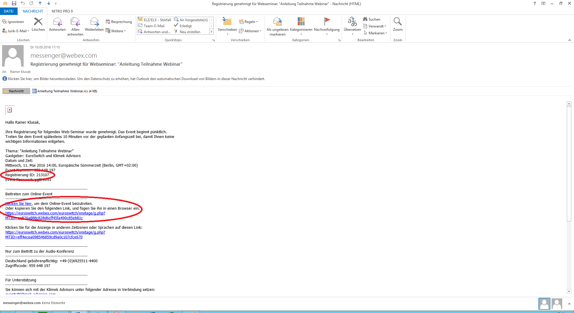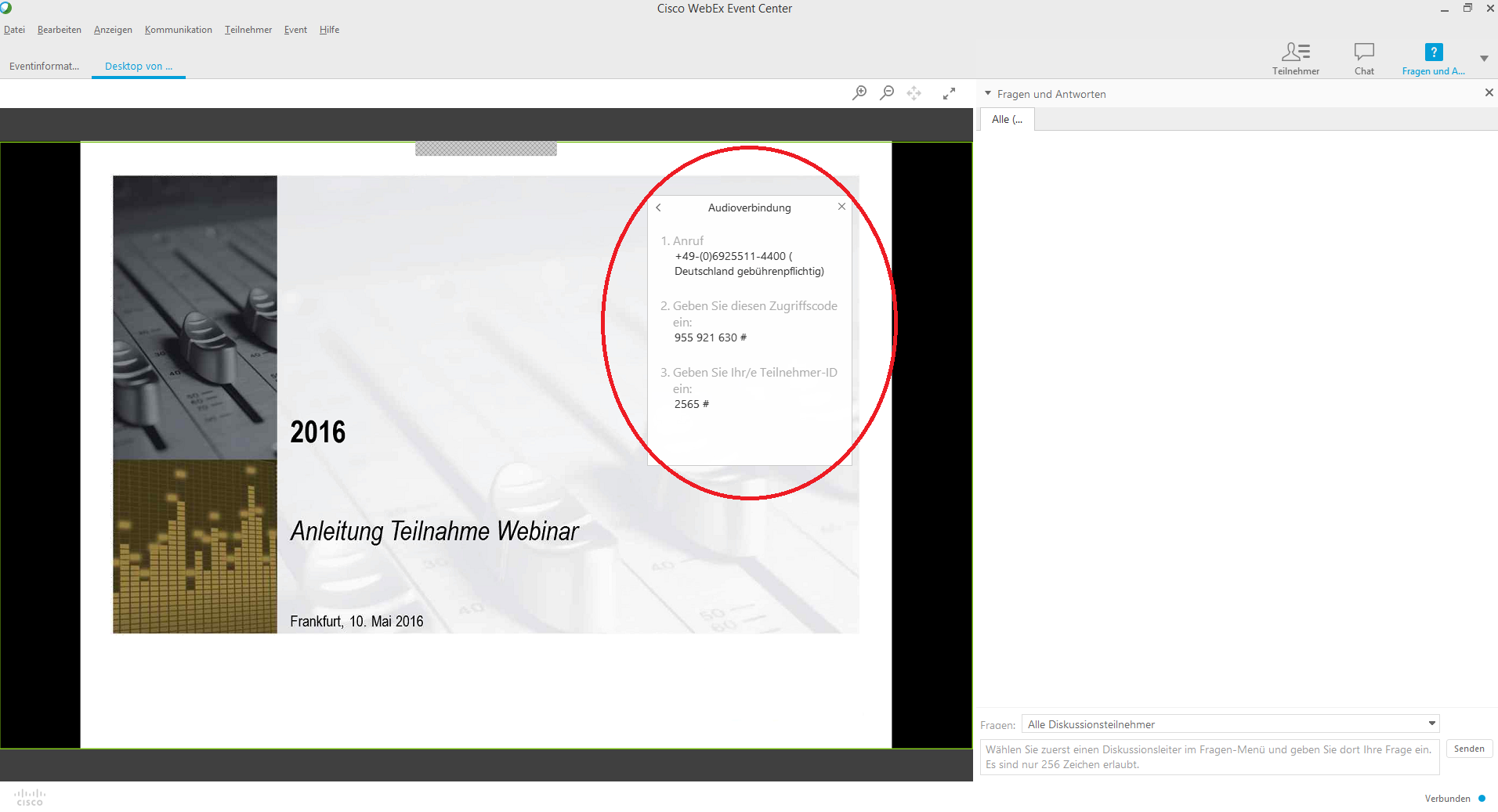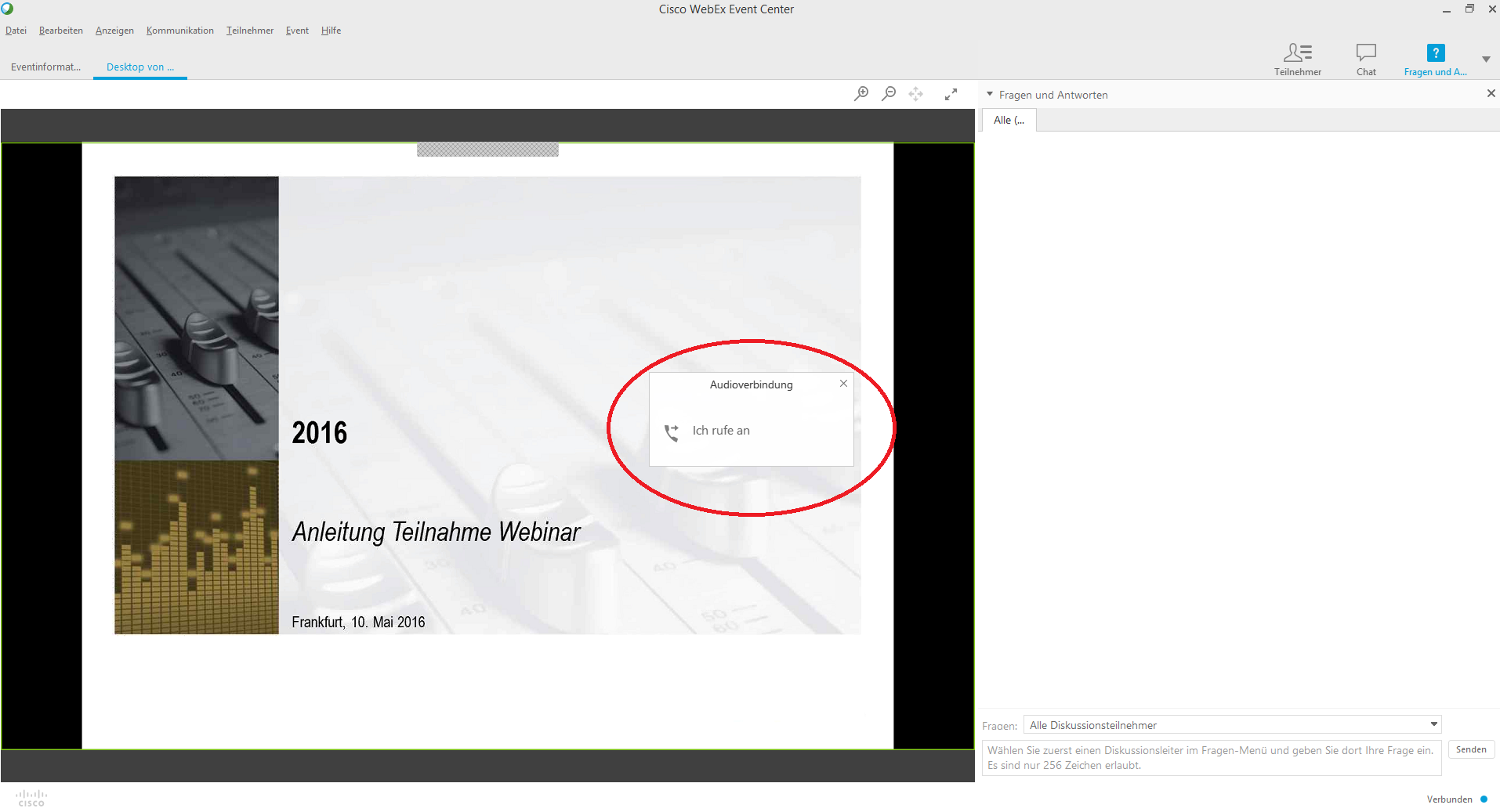 Schritt 2: Auf dem Bildschirm sehen Sie bereits die Präsentation. Um der Audioübertragung beizutreten, klicken Sie auf den Button "Ich rufe an" und folgen Sie den Anweisungen in der nachfolgenden Box. Sie können diese jederzeit über das Menü Kommunikation>Audioverbindung wiederherstellen.