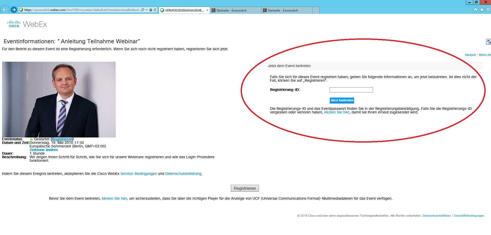 Schritt 1: Öffnen Sie am Tag des Webinars den Zugangslink in der Bestätigungs-E-Mail. In der Regel kann man 10 Minuten vor Beginn des Webinars der Sitzung beitreten. Tragen Sie am rechten Rand Ihre Registrierungs-ID ein und klicken Sie auf "Jetzt beitreten".
