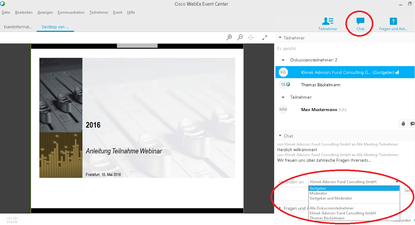 Falls Sie während des Webinars Fragen stellen möchten, klicken Sie auf "Chat" und senden Sie Ihre Nachricht an den Gastgeber.